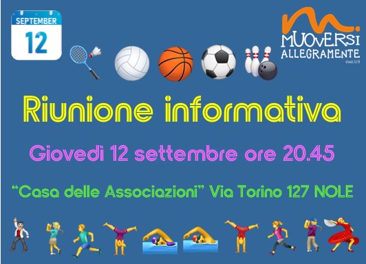 Siete tutti invitati a partecipare alla riunione informativa che si svolgerà giovedì 12 settembre alle ore 20.45 presso la Sala Incontri della Casa delle Associazioni in Via Torino 127 a Nole.
